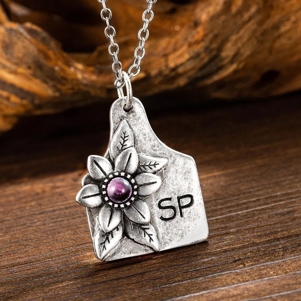 Immerse yourself in the beauty of our Cow Tag Necklace with Custom Birthstone & Initials. This stunning piece showcases a unique floral motif and a customized birthstone in its center. Add your initials, a special number, or your very own ranch logo to truly make it your own. Meticulously handmade from high-quality 925 sterling silver, this necklace is a wonderful present for anyone who loves the farm or has a fondness for cows.