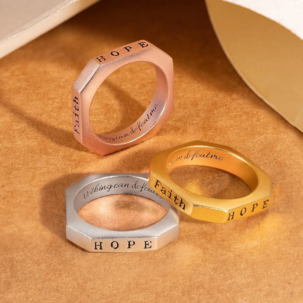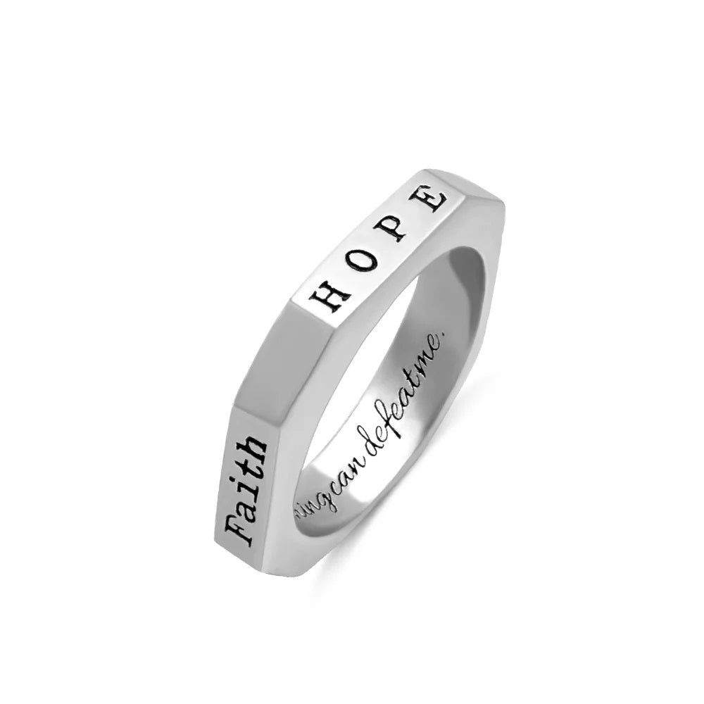 Embrace a symbol of ancient strength when you wear this uniquely designed octagon ring. Make it your very own by personalising up to four engravings with empowering messages, reminding you of your unwavering spirit. Add an extra meaningful touch with an inside engraving visible only to those who truly know you.