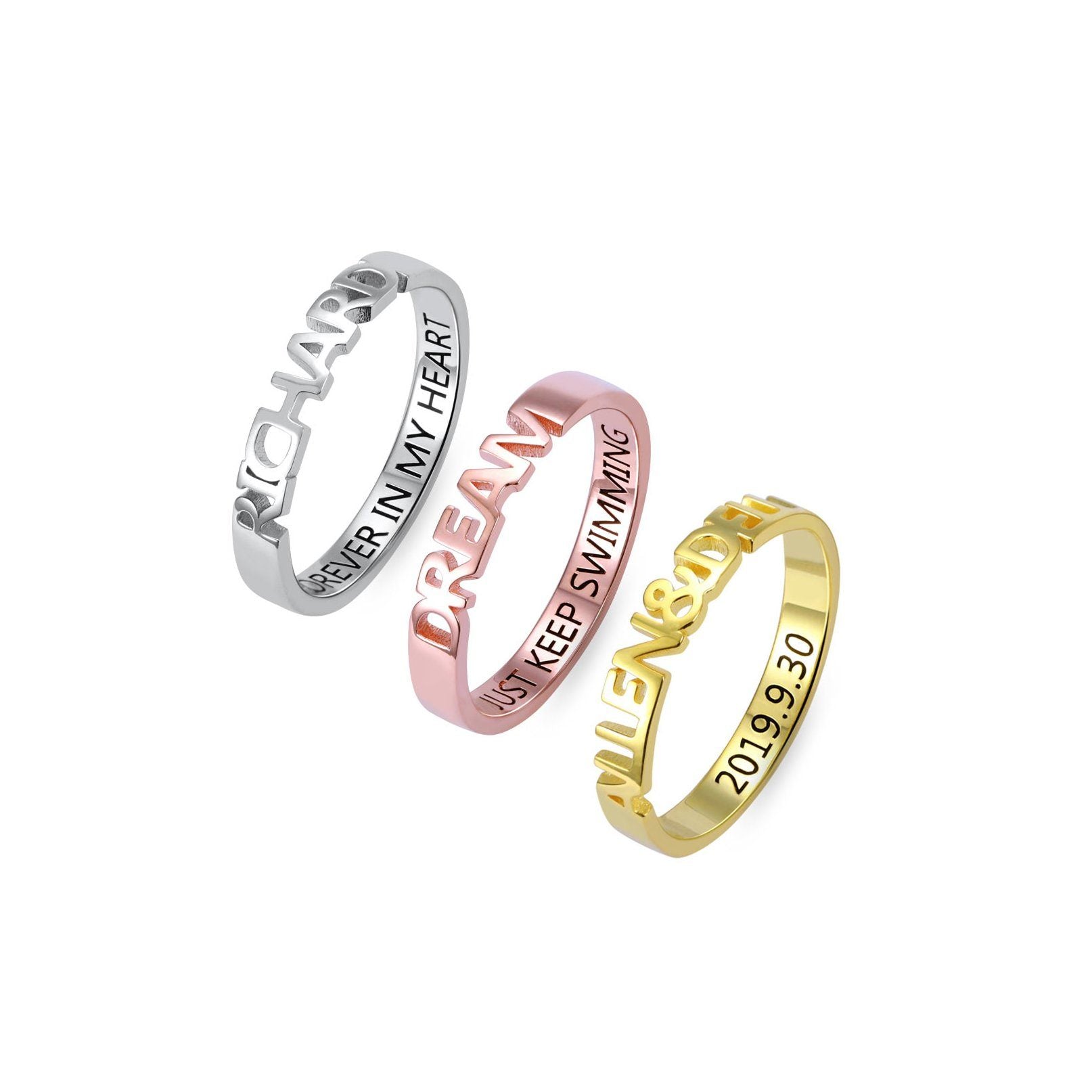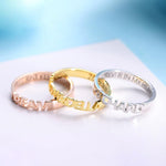 Elevate your style with our exquisite Stackable Name Rings. These dainty, personalised designs can be worn individually or stacked with other rings for a unique look. Make it even more special by adding a personalised inscription on the inside.